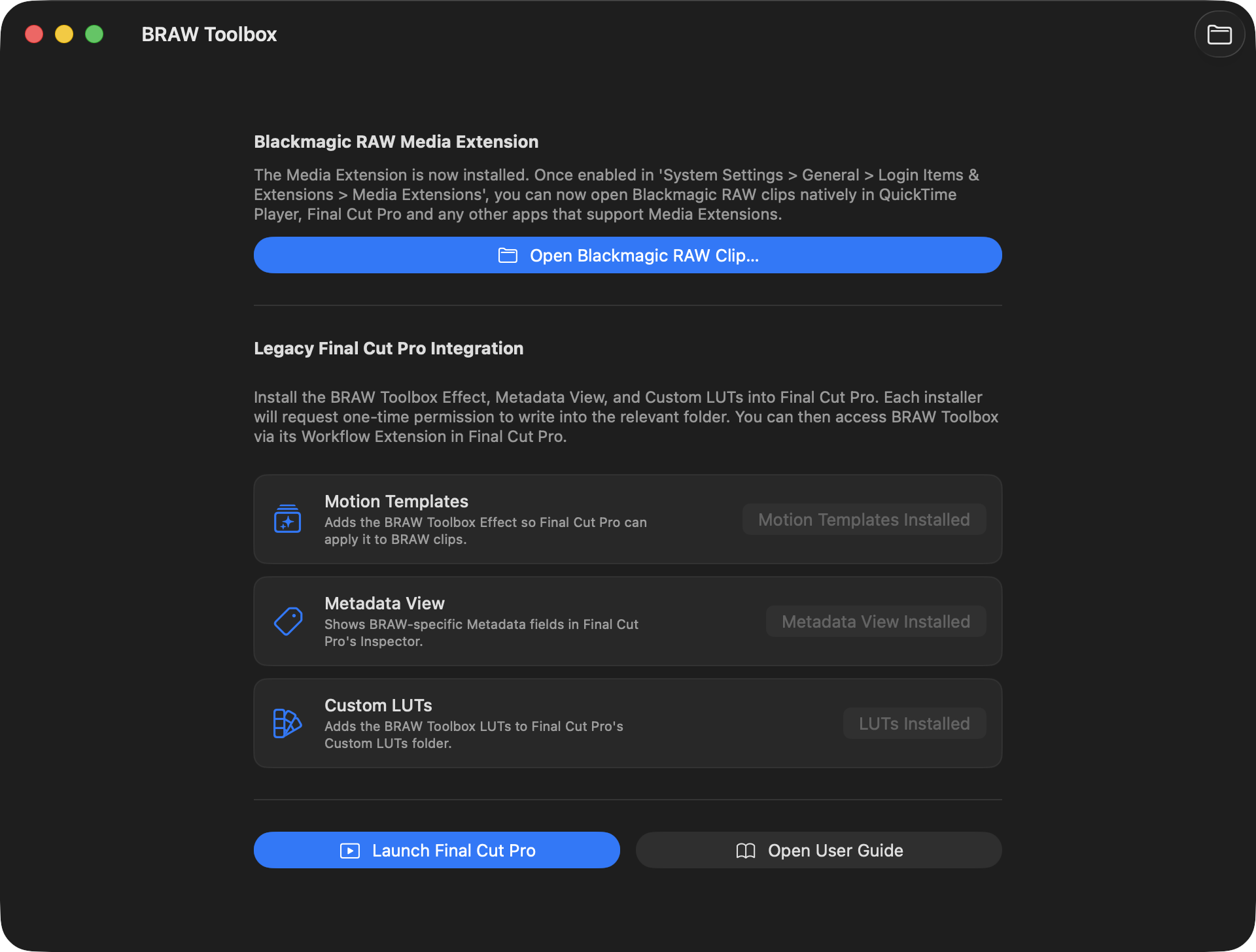 - Added a "Open User Guide" button to the BRAW Toolbox application.