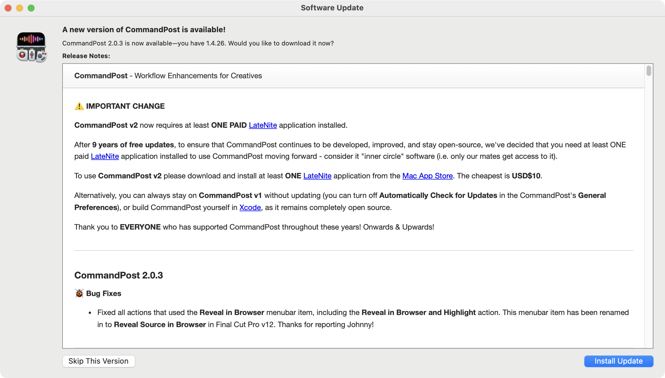 After 9 years of free updates, to ensure that CommandPost continues to be developed, improved, and stay open-source, we've decided that you need at least ONE paid LateNite application installed to use CommandPost moving forward - consider it "inner circle" software (i.e. only our mates get access to it).