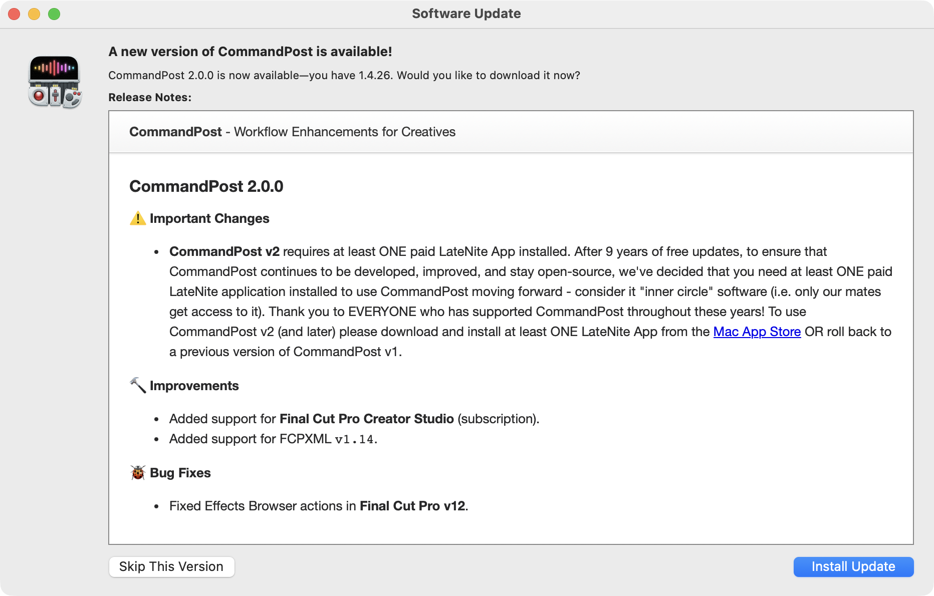 - Added support for Final Cut Pro Creator Studio (subscription).