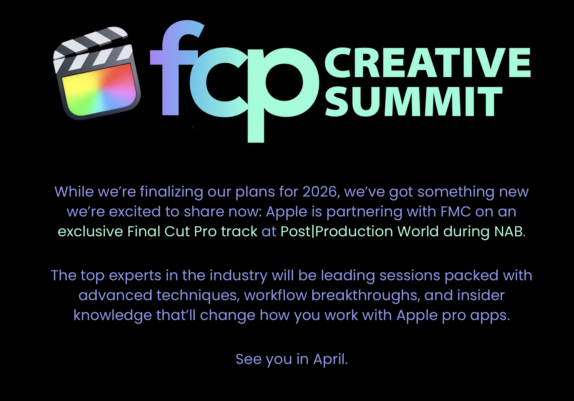 Whilst the FCP Creative Summit looks like it might have quietly disappeared, NAB is going full stream ahead!