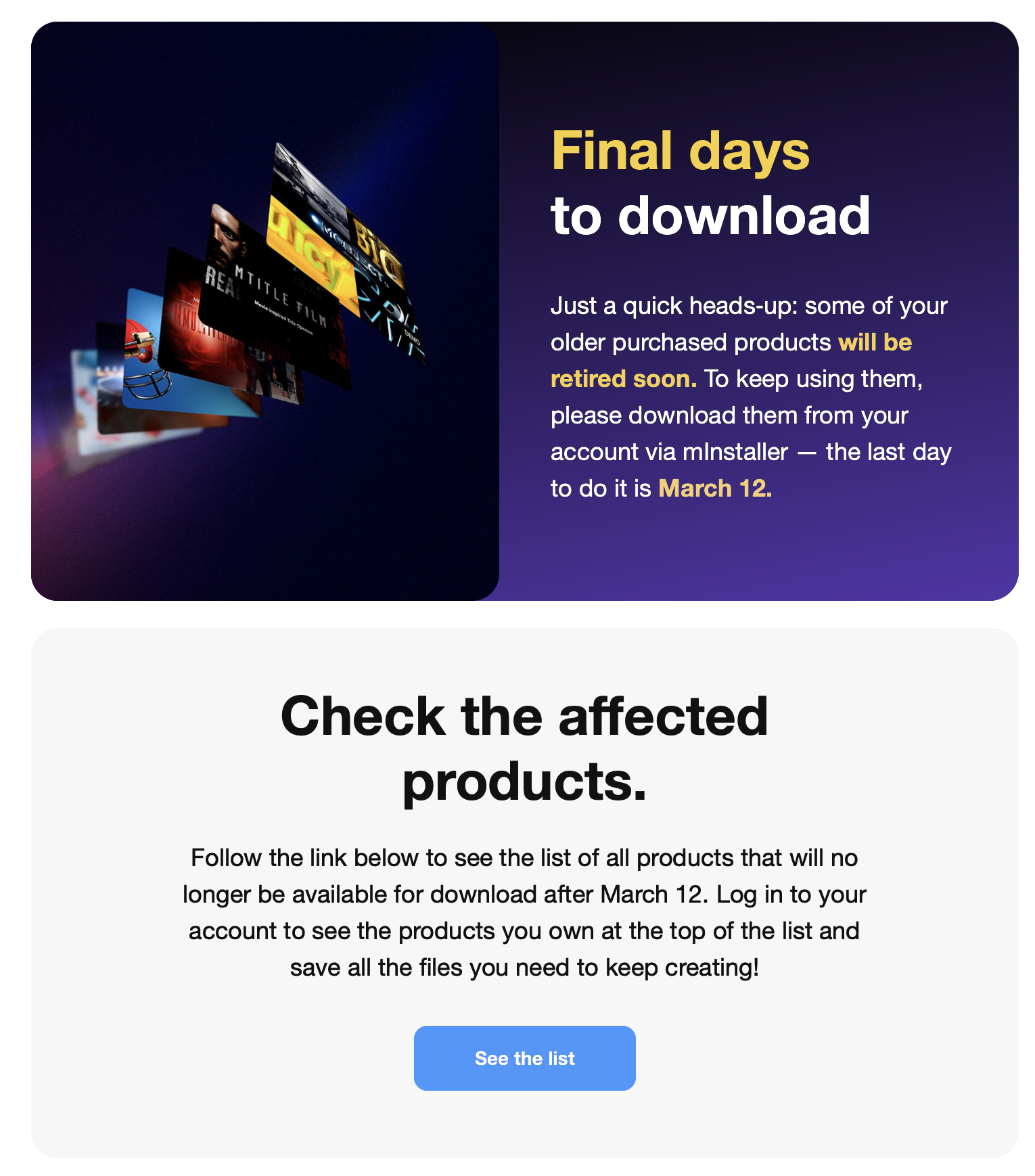 Back on 27th February 2026, MotionVFX sent out a mass email titled, Action required ⚠️ Download your products by March 12.: