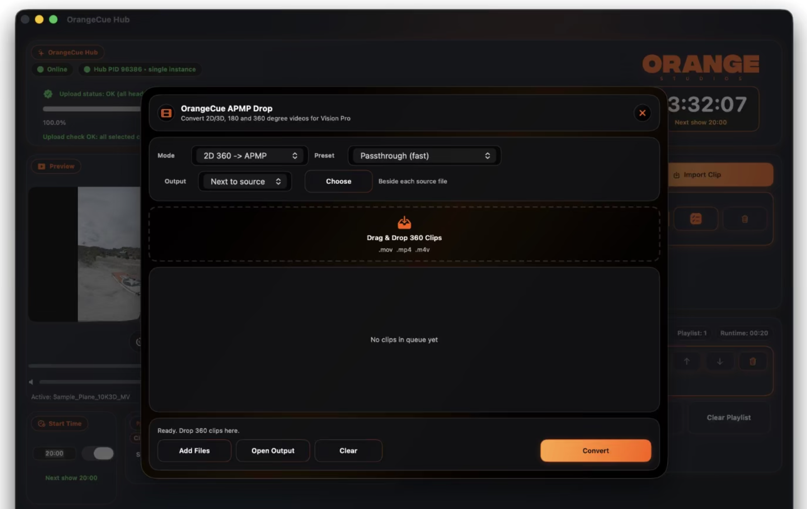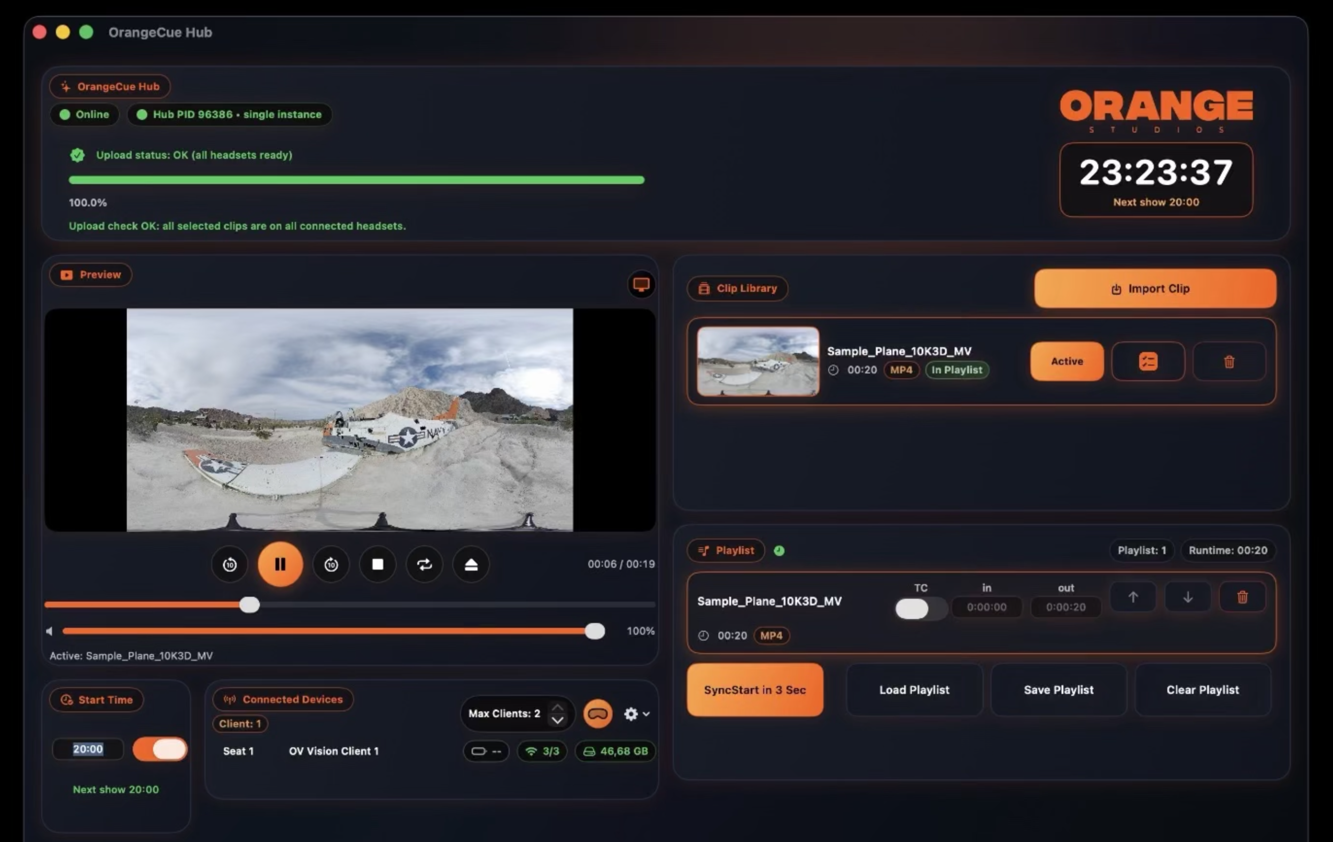 Beyond playback control, OrangeCue provides an end-to-end workflow for immersive show preparation and delivery. OrangeCue APMP Drop converts and packages 360 media for headset playback, OrangeCue Cable Uploader enables reliable wired transfer of large files, and Stream Deck support adds tactile control for event environments. Designed for operation across devices on the same local network, OrangeCue brings synchronized playback, media preparation, deployment, monitoring, and mobile remote control together in one streamlined solution for immersive screenings, installations, live events, and shared audience experiences.