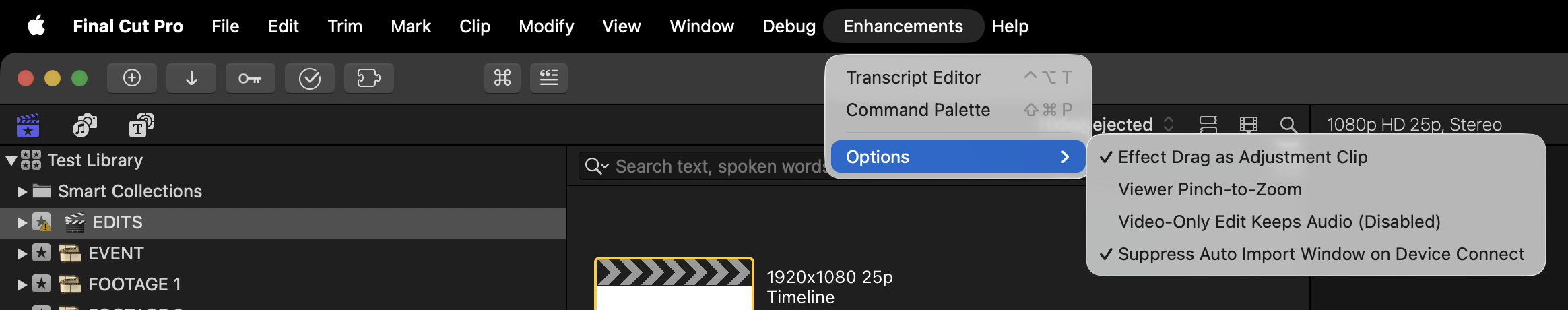 - "Enhancements" menu: Final Cut Pro menu bar item renamed from product name to feature-oriented label