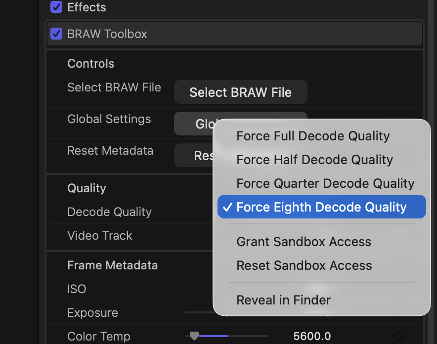 You'll notice that the timeline is an INSANE 16320x7200 @ 90fps, so unless you have a fully spec'd out Mac Studio, you'll most likely want to debayer at Eighth Decode Quality, which you can easily force for all clips in BRAW Toolbox.